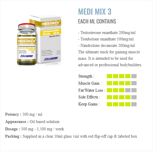 ![]() ![]() Medi Mix 3 injections for sale by the Meditech Pharma steroids company contains 500 mg in total of three different slow acting anabolic esters called TNT. ![]() ![]() ![]() |